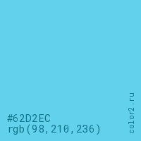 Цвет #62D2EC в цветовой модели RGB обозначается тремя октетами (98, 210, 236) в десятичном формате и #62D2EC в шестнадцатиричном (hex) формате, которые являются интенсивностью красного 98 (hex 62), интенсивность зелёного 210 (hex D2) и интенсивность синего 236 (hex EC).