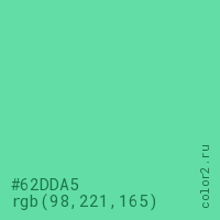 Цвет #62DDA5 в цветовой модели RGB обозначается тремя октетами (98, 221, 165) в десятичном формате и #62DDA5 в шестнадцатиричном (hex) формате, которые являются интенсивностью красного 98 (hex 62), интенсивность зелёного 221 (hex DD) и интенсивность синего 165 (hex A5).