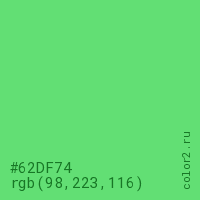 Цвет #62DF74 в цветовой модели RGB обозначается тремя октетами (98, 223, 116) в десятичном формате и #62DF74 в шестнадцатиричном (hex) формате, которые являются интенсивностью красного 98 (hex 62), интенсивность зелёного 223 (hex DF) и интенсивность синего 116 (hex 74).