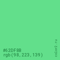 Цвет #62DF8B в цветовой модели RGB обозначается тремя октетами (98, 223, 139) в десятичном формате и #62DF8B в шестнадцатиричном (hex) формате, которые являются интенсивностью красного 98 (hex 62), интенсивность зелёного 223 (hex DF) и интенсивность синего 139 (hex 8B).