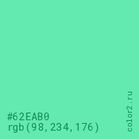 Цвет #62EAB0 в цветовой модели RGB обозначается тремя октетами (98, 234, 176) в десятичном формате и #62EAB0 в шестнадцатиричном (hex) формате, которые являются интенсивностью красного 98 (hex 62), интенсивность зелёного 234 (hex EA) и интенсивность синего 176 (hex B0).