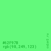 Цвет #62F97B в цветовой модели RGB обозначается тремя октетами (98, 249, 123) в десятичном формате и #62F97B в шестнадцатиричном (hex) формате, которые являются интенсивностью красного 98 (hex 62), интенсивность зелёного 249 (hex F9) и интенсивность синего 123 (hex 7B).
