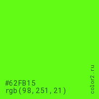 Цвет #62FB15 в цветовой модели RGB обозначается тремя октетами (98, 251, 21) в десятичном формате и #62FB15 в шестнадцатиричном (hex) формате, которые являются интенсивностью красного 98 (hex 62), интенсивность зелёного 251 (hex FB) и интенсивность синего 21 (hex 15).