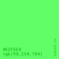 Цвет #62FE68 в цветовой модели RGB обозначается тремя октетами (98, 254, 104) в десятичном формате и #62FE68 в шестнадцатиричном (hex) формате, которые являются интенсивностью красного 98 (hex 62), интенсивность зелёного 254 (hex FE) и интенсивность синего 104 (hex 68).