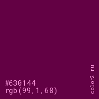 Цвет #630144 в цветовой модели RGB обозначается тремя октетами (99, 1, 68) в десятичном формате и #630144 в шестнадцатиричном (hex) формате, которые являются интенсивностью красного 99 (hex 63), интенсивность зелёного 1 (hex 01) и интенсивность синего 68 (hex 44).