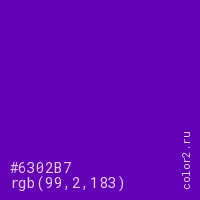 Цвет #6302B7 в цветовой модели RGB обозначается тремя октетами (99, 2, 183) в десятичном формате и #6302B7 в шестнадцатиричном (hex) формате, которые являются интенсивностью красного 99 (hex 63), интенсивность зелёного 2 (hex 02) и интенсивность синего 183 (hex B7).