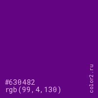 Цвет #630482 в цветовой модели RGB обозначается тремя октетами (99, 4, 130) в десятичном формате и #630482 в шестнадцатиричном (hex) формате, которые являются интенсивностью красного 99 (hex 63), интенсивность зелёного 4 (hex 04) и интенсивность синего 130 (hex 82).