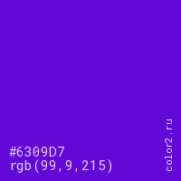 Цвет #6309D7 в цветовой модели RGB обозначается тремя октетами (99, 9, 215) в десятичном формате и #6309D7 в шестнадцатиричном (hex) формате, которые являются интенсивностью красного 99 (hex 63), интенсивность зелёного 9 (hex 09) и интенсивность синего 215 (hex D7).