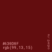 Цвет #630D0F в цветовой модели RGB обозначается тремя октетами (99, 13, 15) в десятичном формате и #630D0F в шестнадцатиричном (hex) формате, которые являются интенсивностью красного 99 (hex 63), интенсивность зелёного 13 (hex 0D) и интенсивность синего 15 (hex 0F).