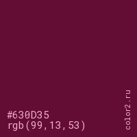 Цвет #630D35 в цветовой модели RGB обозначается тремя октетами (99, 13, 53) в десятичном формате и #630D35 в шестнадцатиричном (hex) формате, которые являются интенсивностью красного 99 (hex 63), интенсивность зелёного 13 (hex 0D) и интенсивность синего 53 (hex 35).