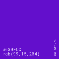 Цвет #630FCC в цветовой модели RGB обозначается тремя октетами (99, 15, 204) в десятичном формате и #630FCC в шестнадцатиричном (hex) формате, которые являются интенсивностью красного 99 (hex 63), интенсивность зелёного 15 (hex 0F) и интенсивность синего 204 (hex CC).