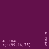 Цвет #63104B в цветовой модели RGB обозначается тремя октетами (99, 16, 75) в десятичном формате и #63104B в шестнадцатиричном (hex) формате, которые являются интенсивностью красного 99 (hex 63), интенсивность зелёного 16 (hex 10) и интенсивность синего 75 (hex 4B).