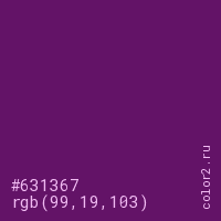 Цвет #631367 в цветовой модели RGB обозначается тремя октетами (99, 19, 103) в десятичном формате и #631367 в шестнадцатиричном (hex) формате, которые являются интенсивностью красного 99 (hex 63), интенсивность зелёного 19 (hex 13) и интенсивность синего 103 (hex 67).
