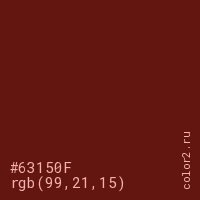 Цвет #63150F в цветовой модели RGB обозначается тремя октетами (99, 21, 15) в десятичном формате и #63150F в шестнадцатиричном (hex) формате, которые являются интенсивностью красного 99 (hex 63), интенсивность зелёного 21 (hex 15) и интенсивность синего 15 (hex 0F).