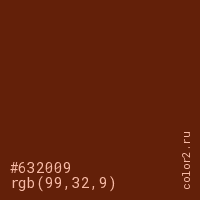Цвет #632009 в цветовой модели RGB обозначается тремя октетами (99, 32, 9) в десятичном формате и #632009 в шестнадцатиричном (hex) формате, которые являются интенсивностью красного 99 (hex 63), интенсивность зелёного 32 (hex 20) и интенсивность синего 9 (hex 09).