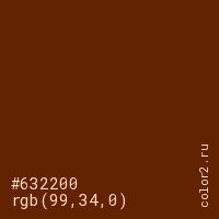 Цвет #632200 в цветовой модели RGB обозначается тремя октетами (99, 34, 0) в десятичном формате и #632200 в шестнадцатиричном (hex) формате, которые являются интенсивностью красного 99 (hex 63), интенсивность зелёного 34 (hex 22) и интенсивность синего 0 (hex 00).