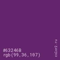 Цвет #63246B в цветовой модели RGB обозначается тремя октетами (99, 36, 107) в десятичном формате и #63246B в шестнадцатиричном (hex) формате, которые являются интенсивностью красного 99 (hex 63), интенсивность зелёного 36 (hex 24) и интенсивность синего 107 (hex 6B).