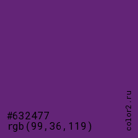 Цвет #632477 в цветовой модели RGB обозначается тремя октетами (99, 36, 119) в десятичном формате и #632477 в шестнадцатиричном (hex) формате, которые являются интенсивностью красного 99 (hex 63), интенсивность зелёного 36 (hex 24) и интенсивность синего 119 (hex 77).