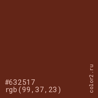 Цвет #632517 в цветовой модели RGB обозначается тремя октетами (99, 37, 23) в десятичном формате и #632517 в шестнадцатиричном (hex) формате, которые являются интенсивностью красного 99 (hex 63), интенсивность зелёного 37 (hex 25) и интенсивность синего 23 (hex 17).