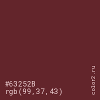Цвет #63252B в цветовой модели RGB обозначается тремя октетами (99, 37, 43) в десятичном формате и #63252B в шестнадцатиричном (hex) формате, которые являются интенсивностью красного 99 (hex 63), интенсивность зелёного 37 (hex 25) и интенсивность синего 43 (hex 2B).