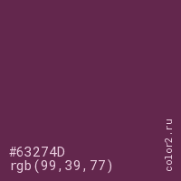 Цвет #63274D в цветовой модели RGB обозначается тремя октетами (99, 39, 77) в десятичном формате и #63274D в шестнадцатиричном (hex) формате, которые являются интенсивностью красного 99 (hex 63), интенсивность зелёного 39 (hex 27) и интенсивность синего 77 (hex 4D).