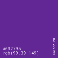 Цвет #632795 в цветовой модели RGB обозначается тремя октетами (99, 39, 149) в десятичном формате и #632795 в шестнадцатиричном (hex) формате, которые являются интенсивностью красного 99 (hex 63), интенсивность зелёного 39 (hex 27) и интенсивность синего 149 (hex 95).