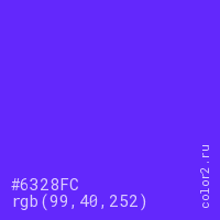 Цвет #6328FC в цветовой модели RGB обозначается тремя октетами (99, 40, 252) в десятичном формате и #6328FC в шестнадцатиричном (hex) формате, которые являются интенсивностью красного 99 (hex 63), интенсивность зелёного 40 (hex 28) и интенсивность синего 252 (hex FC).