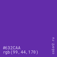 Цвет #632CAA в цветовой модели RGB обозначается тремя октетами (99, 44, 170) в десятичном формате и #632CAA в шестнадцатиричном (hex) формате, которые являются интенсивностью красного 99 (hex 63), интенсивность зелёного 44 (hex 2C) и интенсивность синего 170 (hex AA).