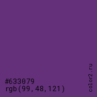Цвет #633079 в цветовой модели RGB обозначается тремя октетами (99, 48, 121) в десятичном формате и #633079 в шестнадцатиричном (hex) формате, которые являются интенсивностью красного 99 (hex 63), интенсивность зелёного 48 (hex 30) и интенсивность синего 121 (hex 79).