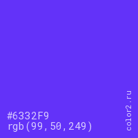 Цвет #6332F9 в цветовой модели RGB обозначается тремя октетами (99, 50, 249) в десятичном формате и #6332F9 в шестнадцатиричном (hex) формате, которые являются интенсивностью красного 99 (hex 63), интенсивность зелёного 50 (hex 32) и интенсивность синего 249 (hex F9).