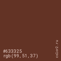Цвет #633325 в цветовой модели RGB обозначается тремя октетами (99, 51, 37) в десятичном формате и #633325 в шестнадцатиричном (hex) формате, которые являются интенсивностью красного 99 (hex 63), интенсивность зелёного 51 (hex 33) и интенсивность синего 37 (hex 25).
