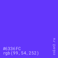 Цвет #6336FC в цветовой модели RGB обозначается тремя октетами (99, 54, 252) в десятичном формате и #6336FC в шестнадцатиричном (hex) формате, которые являются интенсивностью красного 99 (hex 63), интенсивность зелёного 54 (hex 36) и интенсивность синего 252 (hex FC).