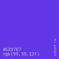 Цвет #6337E7 в цветовой модели RGB обозначается тремя октетами (99, 55, 231) в десятичном формате и #6337E7 в шестнадцатиричном (hex) формате, которые являются интенсивностью красного 99 (hex 63), интенсивность зелёного 55 (hex 37) и интенсивность синего 231 (hex E7).