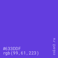 Цвет #633DDF в цветовой модели RGB обозначается тремя октетами (99, 61, 223) в десятичном формате и #633DDF в шестнадцатиричном (hex) формате, которые являются интенсивностью красного 99 (hex 63), интенсивность зелёного 61 (hex 3D) и интенсивность синего 223 (hex DF).