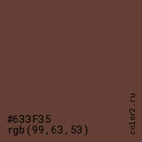 Цвет #633F35 в цветовой модели RGB обозначается тремя октетами (99, 63, 53) в десятичном формате и #633F35 в шестнадцатиричном (hex) формате, которые являются интенсивностью красного 99 (hex 63), интенсивность зелёного 63 (hex 3F) и интенсивность синего 53 (hex 35).