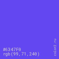 Цвет #6347F0 в цветовой модели RGB обозначается тремя октетами (99, 71, 240) в десятичном формате и #6347F0 в шестнадцатиричном (hex) формате, которые являются интенсивностью красного 99 (hex 63), интенсивность зелёного 71 (hex 47) и интенсивность синего 240 (hex F0).