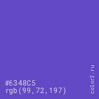 Цвет #6348C5 в цветовой модели RGB обозначается тремя октетами (99, 72, 197) в десятичном формате и #6348C5 в шестнадцатиричном (hex) формате, которые являются интенсивностью красного 99 (hex 63), интенсивность зелёного 72 (hex 48) и интенсивность синего 197 (hex C5).