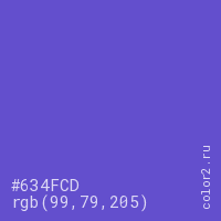 Цвет #634FCD в цветовой модели RGB обозначается тремя октетами (99, 79, 205) в десятичном формате и #634FCD в шестнадцатиричном (hex) формате, которые являются интенсивностью красного 99 (hex 63), интенсивность зелёного 79 (hex 4F) и интенсивность синего 205 (hex CD).