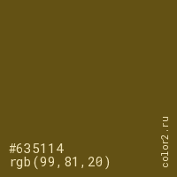 Цвет #635114 в цветовой модели RGB обозначается тремя октетами (99, 81, 20) в десятичном формате и #635114 в шестнадцатиричном (hex) формате, которые являются интенсивностью красного 99 (hex 63), интенсивность зелёного 81 (hex 51) и интенсивность синего 20 (hex 14).
