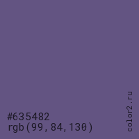 Цвет #635482 в цветовой модели RGB обозначается тремя октетами (99, 84, 130) в десятичном формате и #635482 в шестнадцатиричном (hex) формате, которые являются интенсивностью красного 99 (hex 63), интенсивность зелёного 84 (hex 54) и интенсивность синего 130 (hex 82).