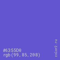 Цвет #6355D0 в цветовой модели RGB обозначается тремя октетами (99, 85, 208) в десятичном формате и #6355D0 в шестнадцатиричном (hex) формате, которые являются интенсивностью красного 99 (hex 63), интенсивность зелёного 85 (hex 55) и интенсивность синего 208 (hex D0).