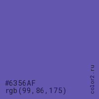 Цвет #6356AF в цветовой модели RGB обозначается тремя октетами (99, 86, 175) в десятичном формате и #6356AF в шестнадцатиричном (hex) формате, которые являются интенсивностью красного 99 (hex 63), интенсивность зелёного 86 (hex 56) и интенсивность синего 175 (hex AF).