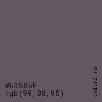 Цвет #63585F в цветовой модели RGB обозначается тремя октетами (99, 88, 95) в десятичном формате и #63585F в шестнадцатиричном (hex) формате, которые являются интенсивностью красного 99 (hex 63), интенсивность зелёного 88 (hex 58) и интенсивность синего 95 (hex 5F).