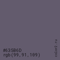 Цвет #635B6D в цветовой модели RGB обозначается тремя октетами (99, 91, 109) в десятичном формате и #635B6D в шестнадцатиричном (hex) формате, которые являются интенсивностью красного 99 (hex 63), интенсивность зелёного 91 (hex 5B) и интенсивность синего 109 (hex 6D).