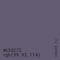 Цвет #635C72 в цветовой модели RGB обозначается тремя октетами (99, 92, 114) в десятичном формате и #635C72 в шестнадцатиричном (hex) формате, которые являются интенсивностью красного 99 (hex 63), интенсивность зелёного 92 (hex 5C) и интенсивность синего 114 (hex 72).