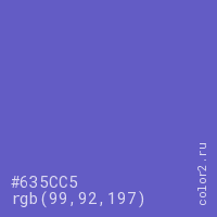 Цвет #635CC5 в цветовой модели RGB обозначается тремя октетами (99, 92, 197) в десятичном формате и #635CC5 в шестнадцатиричном (hex) формате, которые являются интенсивностью красного 99 (hex 63), интенсивность зелёного 92 (hex 5C) и интенсивность синего 197 (hex C5).