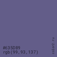Цвет #635D89 в цветовой модели RGB обозначается тремя октетами (99, 93, 137) в десятичном формате и #635D89 в шестнадцатиричном (hex) формате, которые являются интенсивностью красного 99 (hex 63), интенсивность зелёного 93 (hex 5D) и интенсивность синего 137 (hex 89).