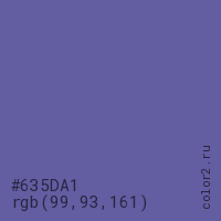 Цвет #635DA1 в цветовой модели RGB обозначается тремя октетами (99, 93, 161) в десятичном формате и #635DA1 в шестнадцатиричном (hex) формате, которые являются интенсивностью красного 99 (hex 63), интенсивность зелёного 93 (hex 5D) и интенсивность синего 161 (hex A1).
