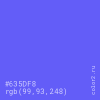 Цвет #635DF8 в цветовой модели RGB обозначается тремя октетами (99, 93, 248) в десятичном формате и #635DF8 в шестнадцатиричном (hex) формате, которые являются интенсивностью красного 99 (hex 63), интенсивность зелёного 93 (hex 5D) и интенсивность синего 248 (hex F8).