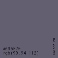 Цвет #635E70 в цветовой модели RGB обозначается тремя октетами (99, 94, 112) в десятичном формате и #635E70 в шестнадцатиричном (hex) формате, которые являются интенсивностью красного 99 (hex 63), интенсивность зелёного 94 (hex 5E) и интенсивность синего 112 (hex 70).